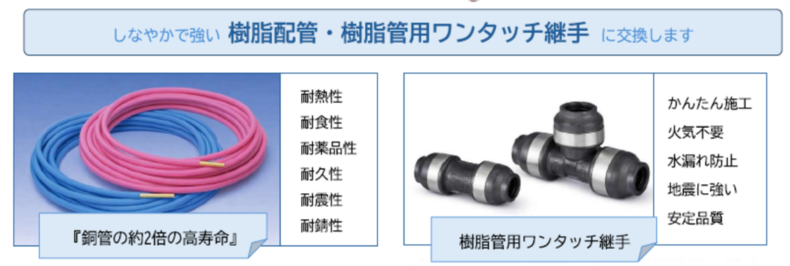 現在の配管材料は、樹脂を使っていますので、紹介した鋳鉄管や銅管と違い非常に高い耐久性能を持っております。