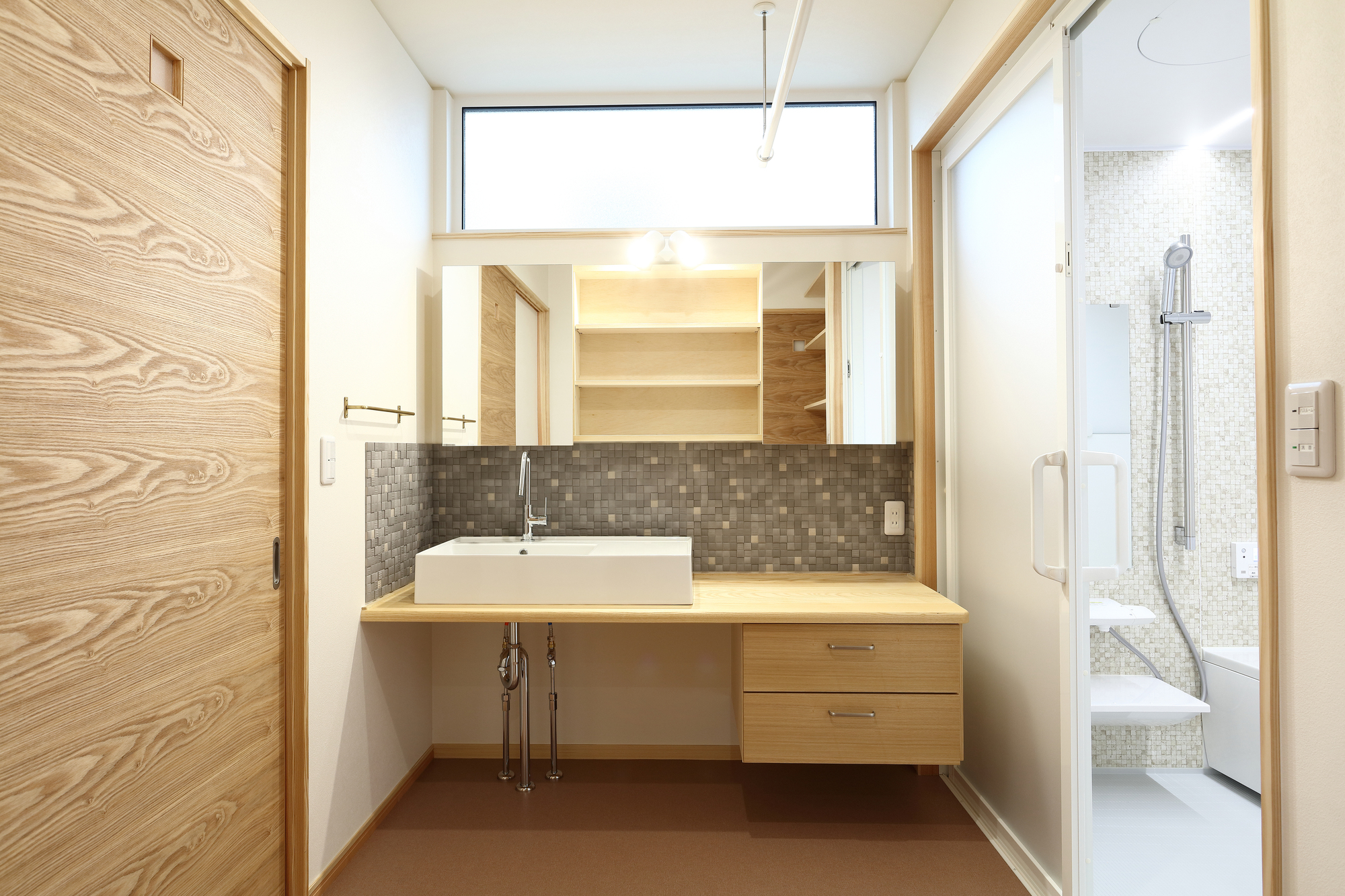 大きな鏡付きの洗面台は、収納力が優れているためすっきりと片付いています。