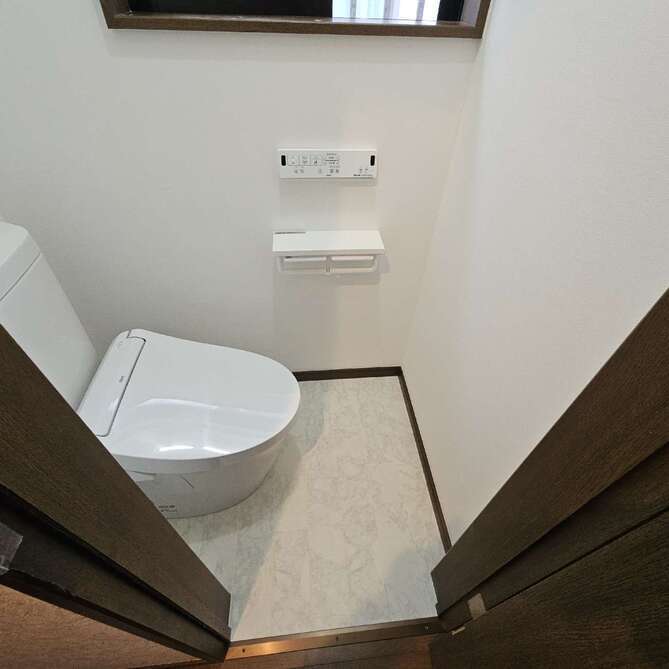 | 施工内容 | トイレ交換 、棚付き紙巻器取付 、天井・壁クロス貼替 、床クッションフロア施工 |