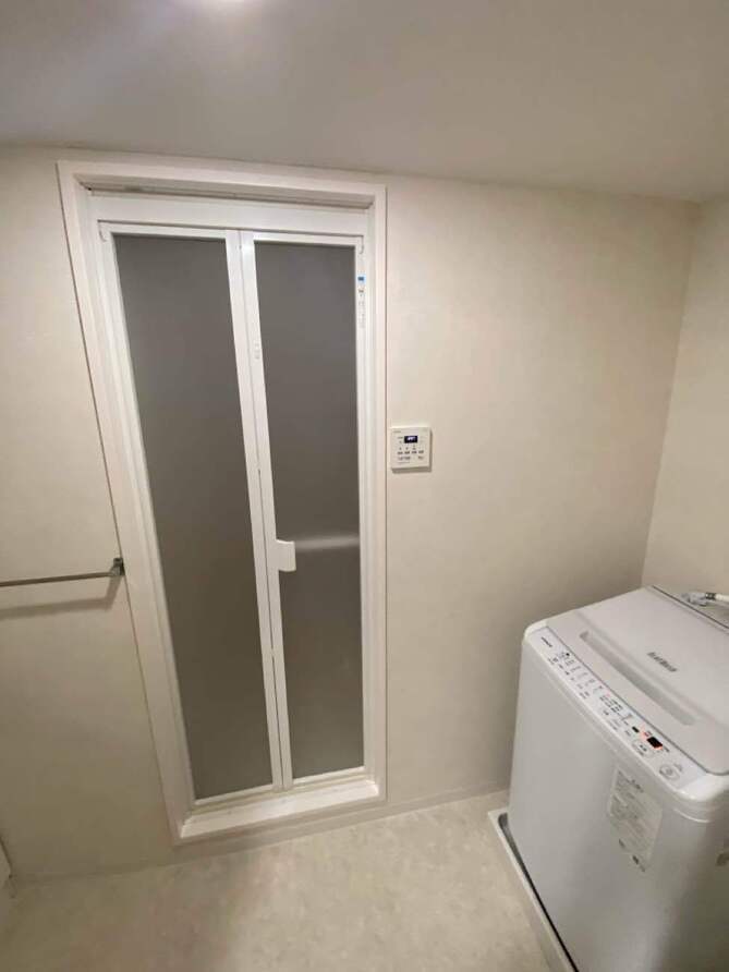 洗面所の天井、壁、床も張替しましたので、大きくなって浴室のドアも綺麗仕上がりました!!